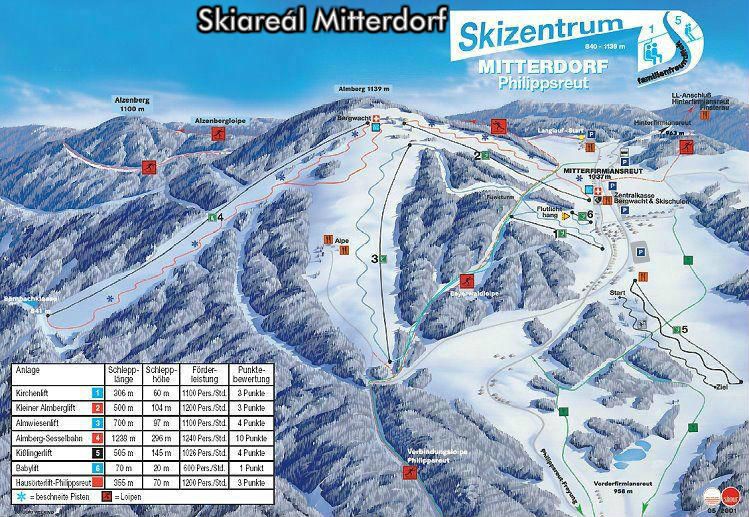 Pod vrcholem Almberg je hlavní křižovatka zdejších lyžařských cest. Máte-li štěstí na počasí, těžko unikne vašemu zraku alpský masív, který lemuje velkou část jižního horizontu. Poté, co se vynadíváte, můžete volit kudy dolů. Z vrcholu Almberg lze sjíždět do tří světových stran. Na výběr je jedna modrá ranvej podobně široká jako dlouhá, dále štíhlá lesní modrá a vrchol nabídky - červená č. 4 s novou dvojsedačkou. Trať je poměrně nová, podobně jako jí provázející dvojsedačka, má pravidelný a rovnoměrný tvar, slušnou šíři. Zásoba dobře preparovaného umělého sněhu funguje jako sněhový základ a v klidu smaže handikep jižní orientace tratě. Při vhodné zalidněnosti by tato trať sedla i racecarverům. Zmiňovaná modrá ranvej je naopak postavená pro poklidné rodinné lyžování a nenáročné vykružování oblouků. Rychlejší lyžař ji však ochutná asi jenom jednou a poté se pustí do hledání něčeho „sytějšího“. Zato rodina s dětmi si na ní může užít příjemné odpoledne. Druhá modrá provede lyžaře lesem na severní část kopce, kde navazuje osvětlená loučka s vlekem. Pohledový plán ukazuje, že se do areálu řadí ještě jedna trať. Leží pod parkovištěm a sjíždí po severním svahu až k údolnímu potůčku, který tvoří hranici mezi Českou republikou a Bavorskem. Přestože trať obhospodařuje pouze méně pohodlná dvojkotva, jen těžko se s ní loučí. Široký slalomák s ostřejší prostřední pasáží poskytne dobrému lyžaři snad vše, co může v těchto podmínkách hledat. Jeho kvalitu umocňuje obvykle velmi řídké zalidnění. Pokud to pod svahem včas neubrzdíte, jste zpátky v Čechách.