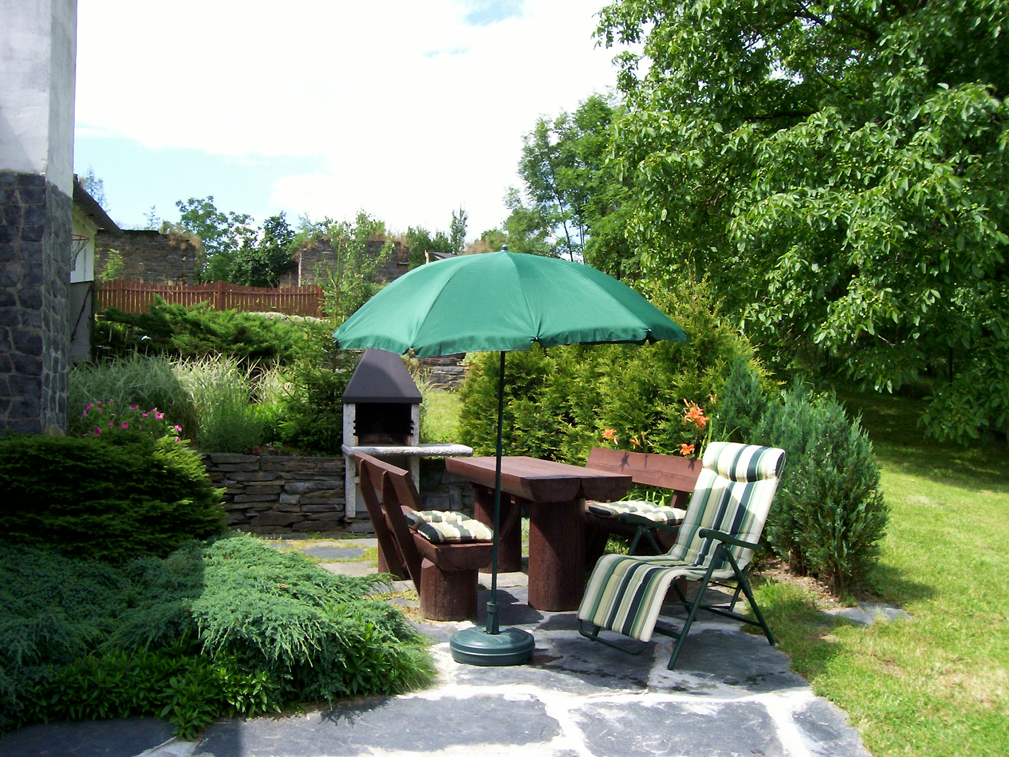 Na zahradě venkovní posezení s krbem - grilem, ohniště s posezením, dřevěné lavice a stůl, 3 lavičky, zahradní nábytek