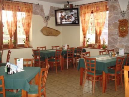 RESTAURACE: Klimatizovaná bezbariérová restaurace je příjemně zařízena v loveckém stylu. V restauraci krb, TV, projektor s velkým projekčním plátnem. Kapacita 60 míst. Nabízíme denní menu, domácí kuchyni a zvěřinu. Příjemné chvíle můžete strávit v naší zahradní restauraci, která je otevřena v teplých měsících, kapacita 100 míst.