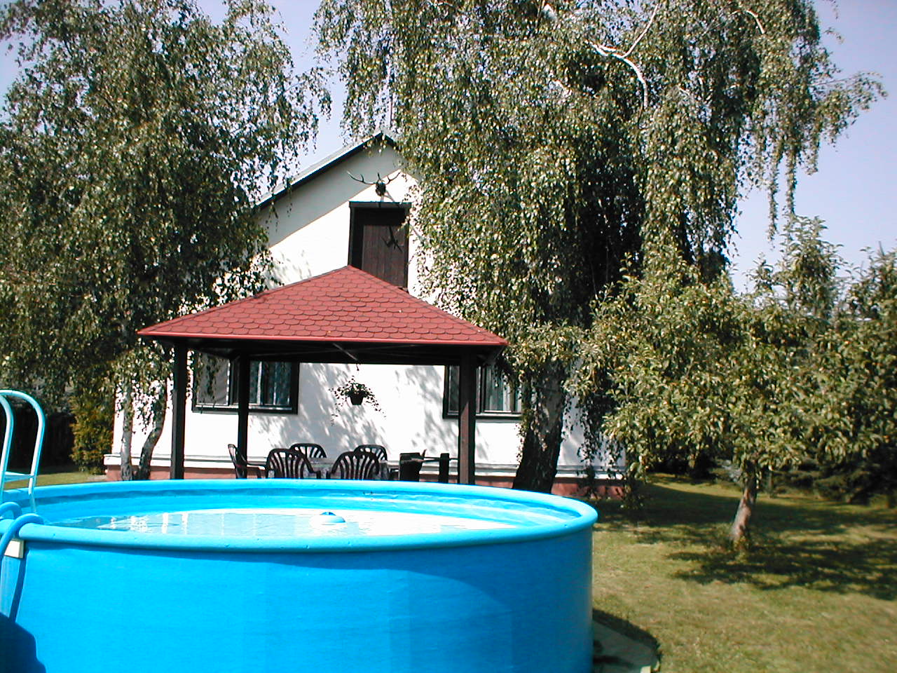 Zahrada s rozlohou bezmála 800m2 nabízí k Vašemu příjemnému pobytu otevřený altán se zahradním nábytkem a dnes už nezbytným grilem. Pro romantické duše je však k dispozici i klasické ohniště. Pro ty nejmenší máme pískoviště a bazén o průměru 3,5m s pískovou filtrací (k dispozici od poloviny června do začátku září).