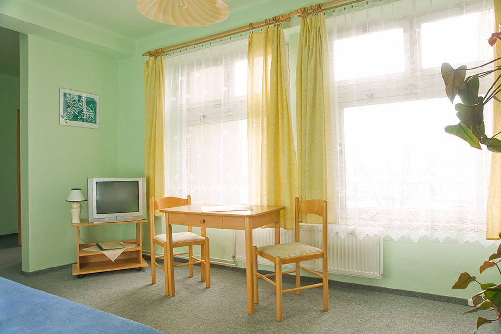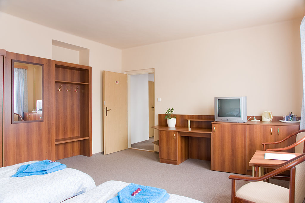 Pokoje jsou standardně vybaveny televizí a lednicí a možností zdarma WIFI připojení. Snídaně podáváme v naší hotelové restauraci formou rautové nabídky.